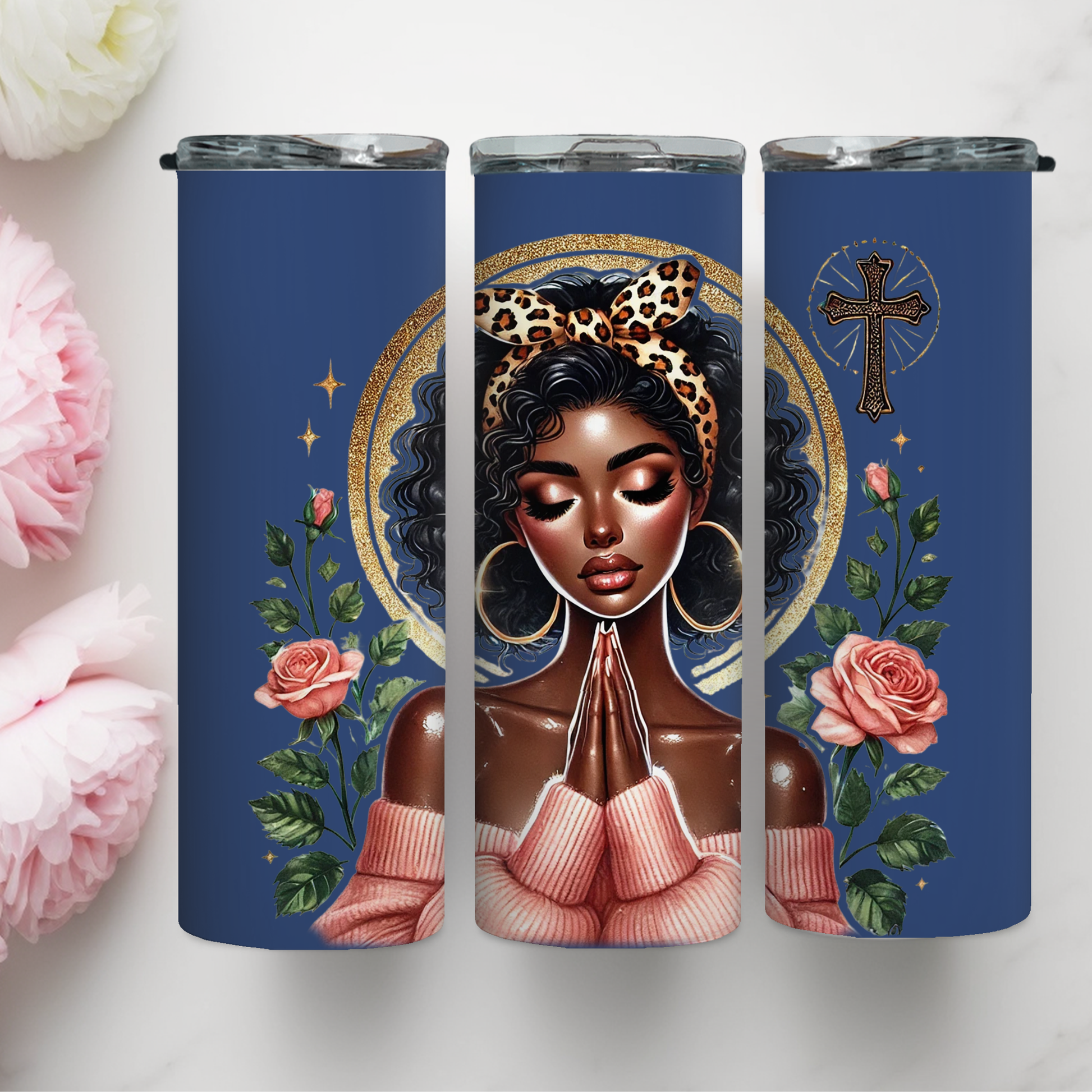 Celebrate beauty, strength, and faith with this stunning 20oz sublimation tumbler. Featuring an elegant design of a praying woman surrounded by soft floral accents and golden tones, this piece is both inspiring and empowering — a daily reminder of grace and perseverance.